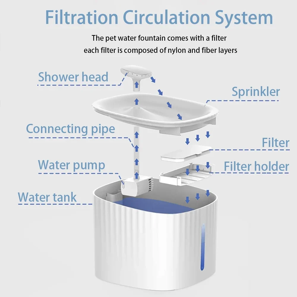 3. 4-Stage Filtration System: In addition to keeping the water fresh through circulation, the 4-stage system includes activated carbon and cotton layers, ion exchange resins, and thick non-woven fabrics to make water tastier and safer for pets.
